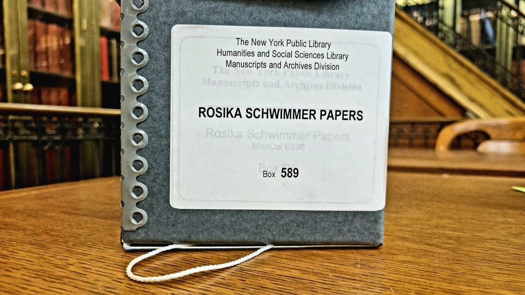 Rosika Schwimmer Papers utolsó doboz. Na jó, nem egészen az utolsó, mert az az 592-es. Azt és az előtte lévő hármat az első könyvtári napomon láttam 2017-ben, mert nyilván azonnal kézbe kellett vennem Schwimmer fekete retiküljét…